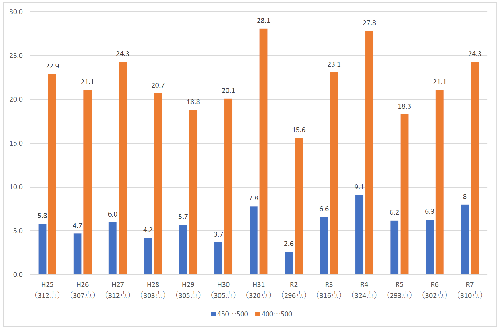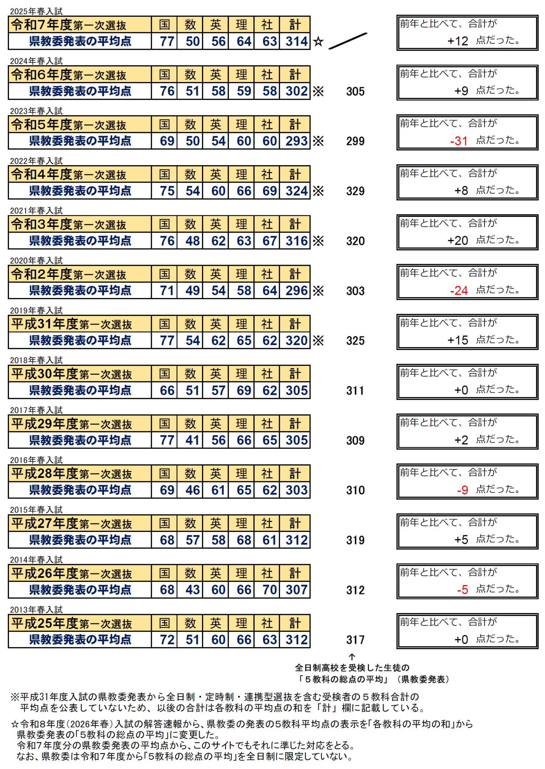 このサイトでもそれにあわせて2025年春入試の合計欄から「5教科の総点の平均」を掲載しています。