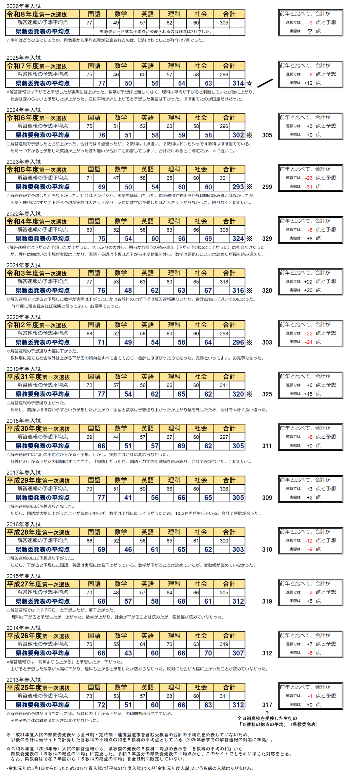 なお、今年からぎふチャンが流した予想平均点と比較される過去の入試の5教科総合の平均点が、県教委発表の「5教科の総点の平均」に変わりました。