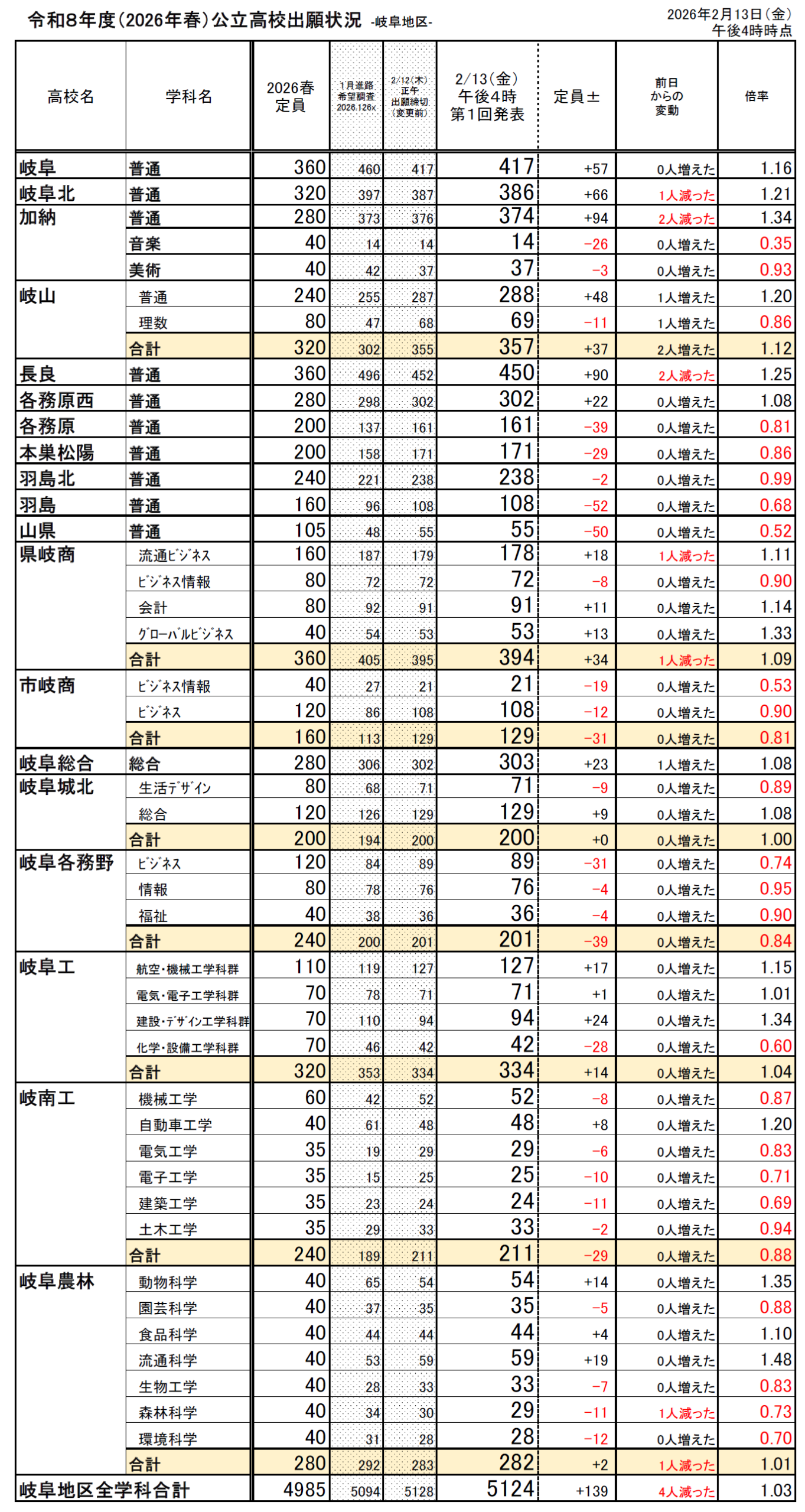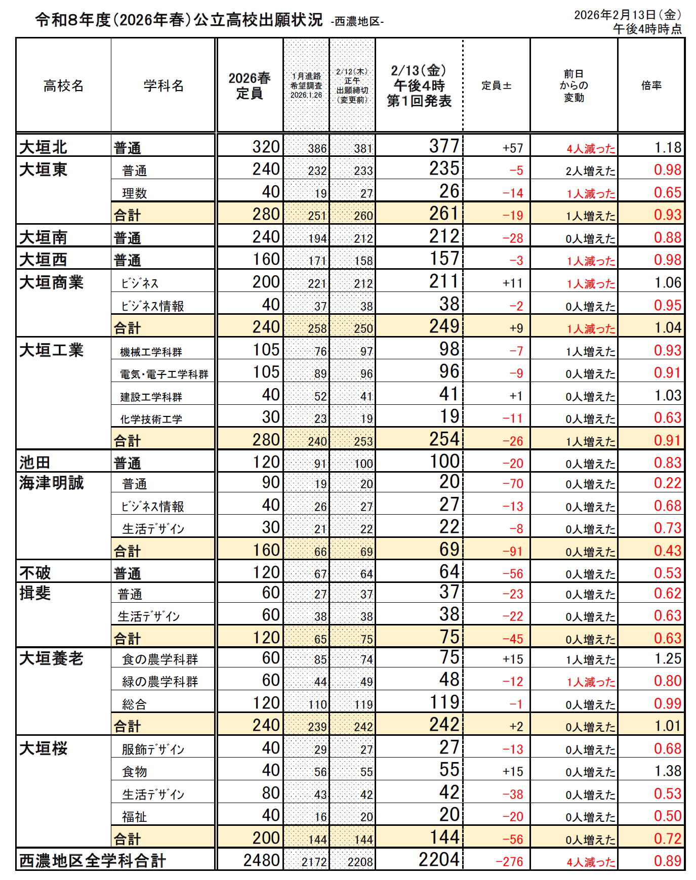 2026年2月13日(金)16時現在の数字が県教委から出ました。相変わらずの分かりにくい表(苦笑)。今年も間違えないように間違えないようにと慎重に打ち込みました。